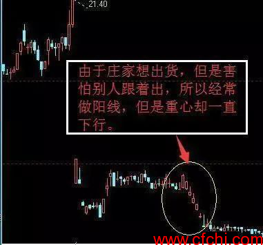 2、由于庄家想出货,但是害怕别人跟着出,所以经常做阳线,但是重心却一直下行。