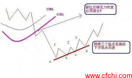 在随后的时间里,必须耐心等待股票见底,比如图一表明的,出现持续三个低点走高,可以沿下方低点买回前期清仓筹码。A-D点都是买回的机会,不过前两个低点只能够试探买进,毕竟探底趋势还在进行,以防再次下行。