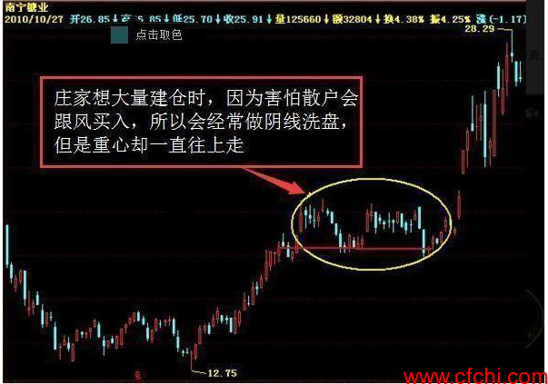 4、庄家想大量建仓时,因为害怕散户会跟风买入,所以会经常做阴线洗盘,但是重心却一直往上走。