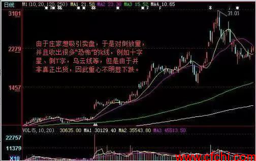 3、由于庄家想吸引卖盘,于是对倒放量,并且收出很多“恐怖”的k线,例如倒T字、乌云线、十字星等,但是由于并非真正出货,因此重心不明显下跌。
