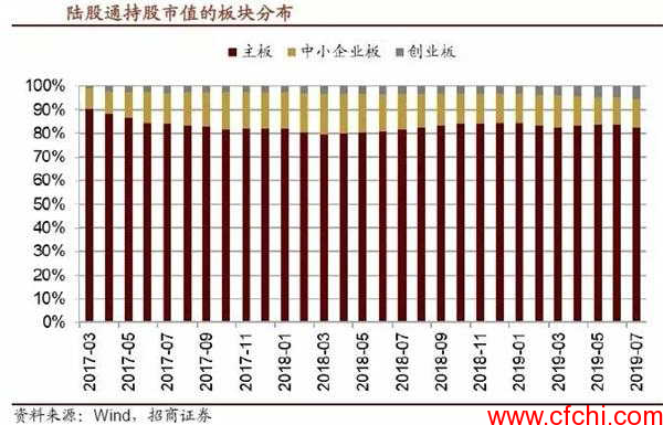 来自招商证券的测算统计显示,截至7月末,北向资金在A股的持股总市值为10544 亿元,较前一个月小幅提高139亿元。分板块看,主板持股市值占比为82.63%,较前一个月下降0.83%;中小板占比为12.12%,环比上升0.24%;创业板占比4.67%,提升0.59%。