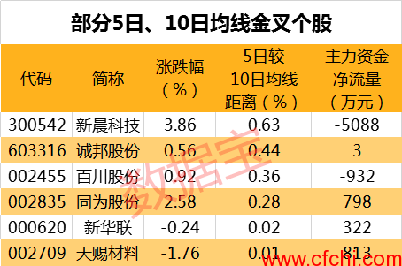 截至最新,有6只A股的5日均线主动上穿10日均线,其中新晨科技、诚邦股份、百川股份等个股的5日均线较10日均线距离最大,分别达0.63%、0.44%、0.36%。
