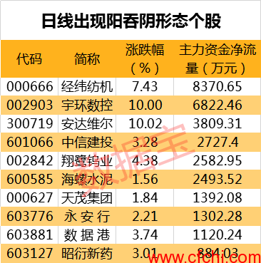 最新盘面显示,两市共有26只个股出现日K线出现阳吞阴形态,当天涨幅最大的是安达维尔、宇环数控、张家界,涨幅分别为10.02%、10%、9.81%。