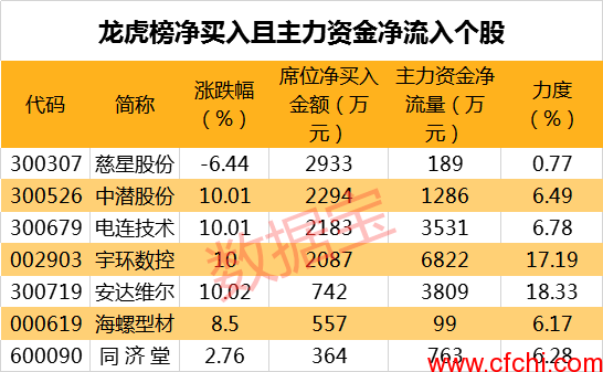 8月6日龙虎榜中机构及营业部席位资金净卖出3.62亿元,其中净买入的个股有10只;净卖出的个股有21只。净买入前三名个股分别是慈星股份、中潜股份、电连技术等,净买入金额占当日成交额比例达11.85%、11.58%、4.19%。