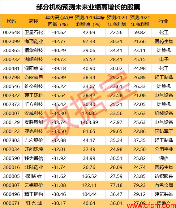 部分上半年业绩高增长低估值的股票受到券商机构的青睐,数据显示,有77只股票有机构预测其未来业绩情况,其中20只股票获5家以上机构预测业绩,且预测2019年、2020年、2021年净利润增速均超20%。