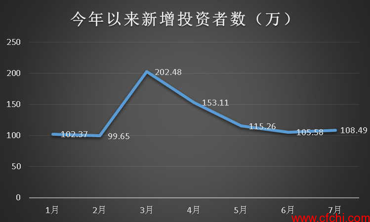 根据中国结算登记公布的最新数据显示,今年7月,证券市场新增投资者达108.49万,环比增长2.76%。而这也是今年3月份以来,首次出现环比上升的情况。