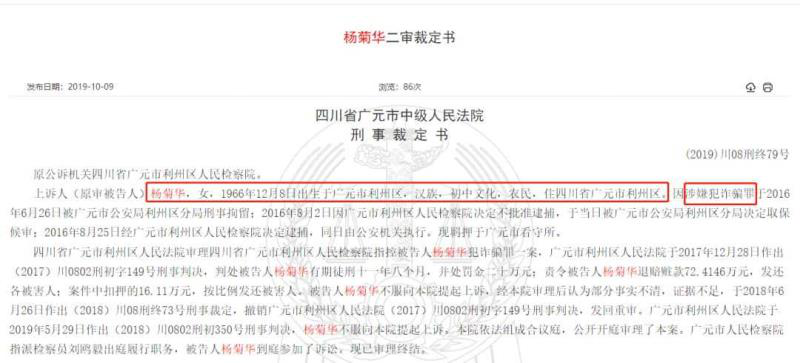近日,中国裁判文书网上,四川省广元市中级人民法院的一份《杨某某二审裁定书》刑事裁定书,曝光了一起自我包装为“股神”行骗的案例,一位50多岁的农村大妈,先后诱骗10余人将400多万交给她。