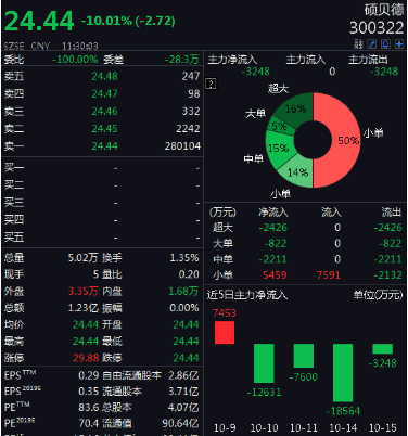 今日早盘,5G概念股龙头硕贝德一字跌停。截至当日午盘收盘,股价报收24.44元,超28万手卖单封在跌停盘上。