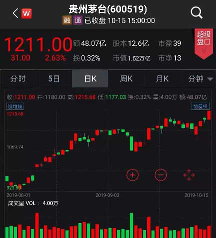 10月15日,贵州茅台收涨2.63%,收盘价1211元/股,再创历史新高,总市值为1.52万亿元,已经超越2018年贵州全省GDP 的1.48万亿元。
