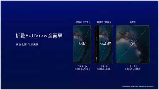 屏幕:8英寸航天级高分子柔性折叠全面屏,折叠后主屏6.6英寸,最薄处厚度5.4毫米。鹰翼式折叠屏零开孔、零挖槽。