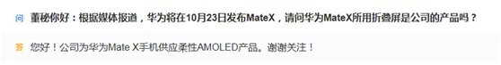 23日上午,公司在平台回应读者时表示,Mate X手机使用的面板就是公司供应的柔性AMOLED面板。