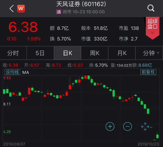 恐慌情绪得以缓解,今日天风证券高开超4%,截止收盘,录得涨幅1.6%。