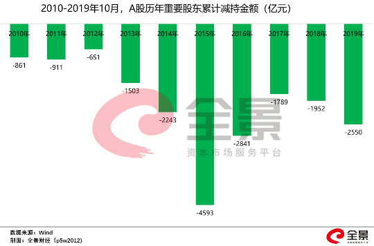 据Wind数据显示,截止到10月23日,2019年已有1532家上市公司累计完成减持240亿股,累计减持市值达2550亿元,已远超过2018年全年的1952亿元,刷新了2016年以来A股的年度减持纪录。