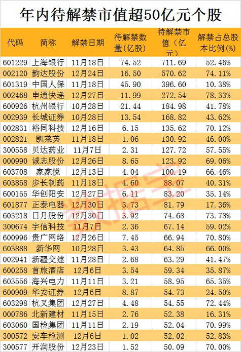 (高能预警,年内解禁市值超50亿元个股名单,已有股票阴跌超20%!)