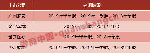 若把时间拉长到今年以来,则沪深两市今年以来至少有107家上市公司曾发布过延期披露定期报告的公告。值得注意的是,广州浪奇、金宇车城、创新医疗、*ST索菱4家公司甚至一拖再拖,不仅在4月延期披露2018年年报/2019年一季报,后来还再次延期披露了2019年半年报和2019年三季报。