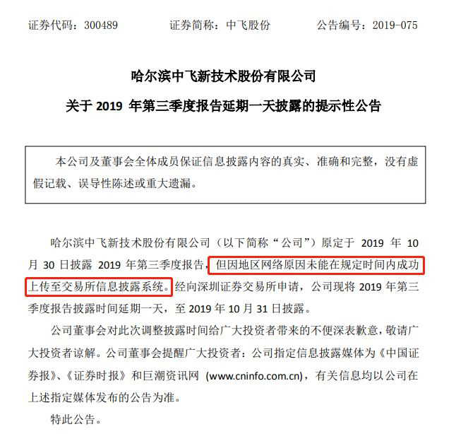 10月30日,上市公司三季报披露已进入倒计时。中飞股份突然发布公告称,该公司原定于10月30日披露2019年第三季度报告,因地区网络原因未能在规定时间内成功上传至交易所信息披露系统。经向深交所申请,现将披露时间延期一天至2019年10月31日。