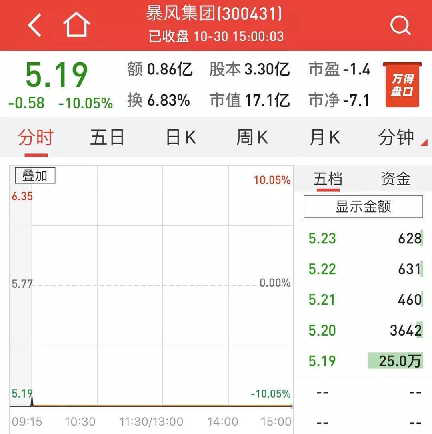 10月30日,暴风集团(300431.SZ)一字跌停,报收5.19元/股,市值17.10亿元,较此前高点时的超400亿市值已缩水九成以上。
