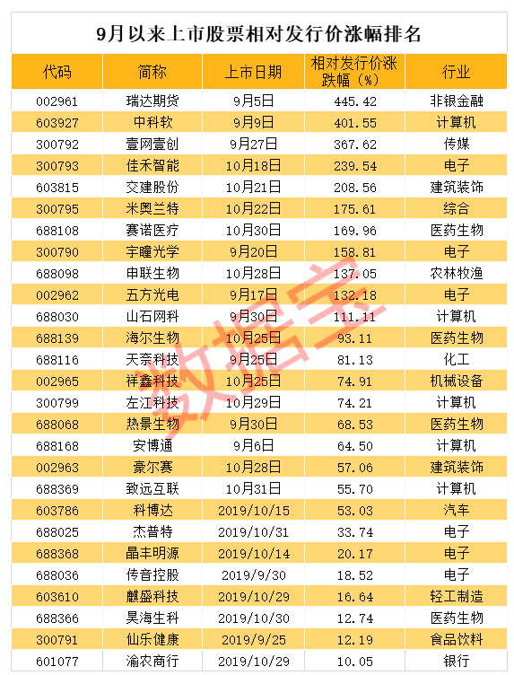 数据显示,9月以来,包括科创板在内,共有27只股票上市,相对发行价涨幅平均达121%。其中,相对发行价涨幅最高的是瑞达期货,涨幅445.42%;其次是中科软,自9月9日上市以来,累计涨幅已有401.55%,排名第三的壹网壹创也不逊色,累计涨幅为367.62%。