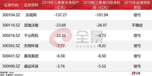 据Wind数据显示,截止到2019年三季度末,坚瑞沃能、千山药机、乐视网、暴风集团、天翔环境、盛运环保的净资产为负。