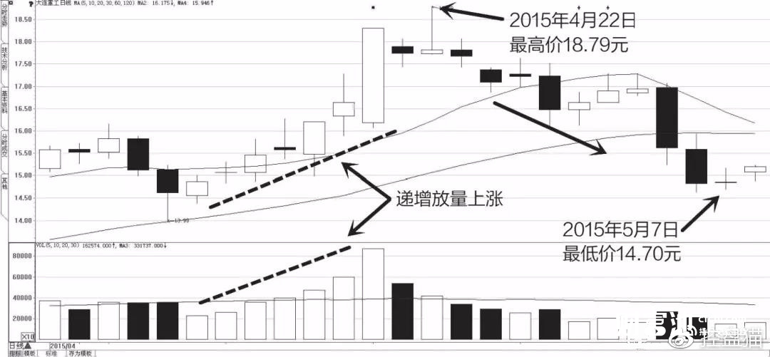 2015年4—5月,大连重工也形成了递增放量上涨,随后该股便开始持续下跌。4月22日该股最高价为18.79元,经过递增放量上涨的打击后,截至5月7日,其最低价已经下滑到14.70元,跌幅达到21.77%(如图6-3所示)。