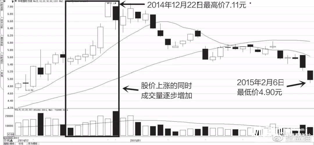 2014年12月22日,该股最高价为7.11元;截至2015年2月6日,其最低价已经下跌到4.90元,其间跌幅达到31.08%。如果没有在成交量最后一次升高的时候及时套现离场,那么就会遭受较大的损失(如图6-2所示)。