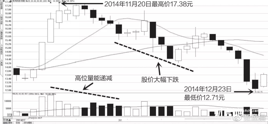 2014年11月中旬至12月初,东风科技也形成了高位量能递减形态。从图6-6中可以看到,2014年11月20日该股最高价为17.38元,但是经过高位量能递减的制约,其股价从上涨趋势转为下跌趋势。经过一段时间的大幅下跌后,截至12月23日,该股最低价跌至12.71元,其间跌幅达26.87%。
