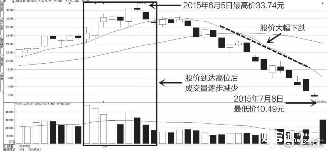 2015年5—6月期间,经过一段时间上涨的启明星辰股价达到高位后,成交量开始逐步减少,当股价于6月5日以33.74元的价格见顶的时候,成交量也完成了最后一次高升,随后就开始逐步减少。