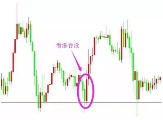 股价本来处于下降趋势中,但后来出现了一根坚挺的实体,这根实体将它前面的那根实体“抱进怀里”或者说把它吞没了。这种情形说明市场上买进的力道已经压倒了卖出的力道。