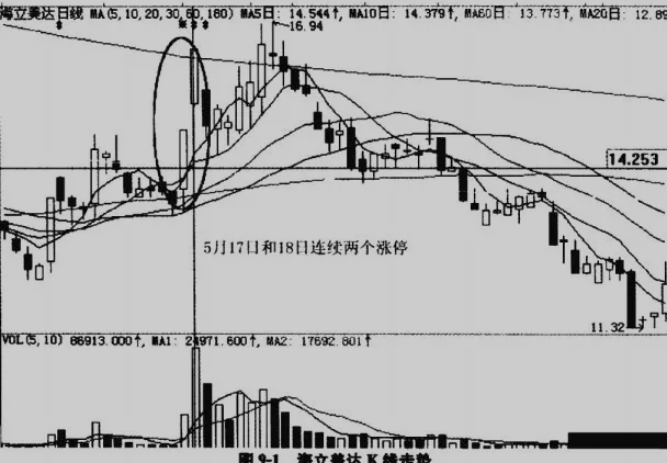 例如,2012年5月13日《中华人民共和国政府、日本国政府及大韩民国政府关于促进、便利和保护投资的协定》在北京正式签署。第五次中日韩领导人会议当日在北京举行,中国、日本、韩国同意年内启动中日韩自由贸易区谈判。这意味着,自2002年开始提出的中日韩自由贸易区设想,将进人正式启动阶段。游资提前捕获这些信息并进行布局,于是,相关的码头、航运、贸易乃至制造业都成为资金炒作的对象。海立美达(002537)因为其和韩国、日本的业务关系密切,而被提升为中日韩自由贸易区概念股遭到爆炒,在2012年业绩预亏30%的情况下,该股在5月17日和18日连续两个涨停(见图9-1)