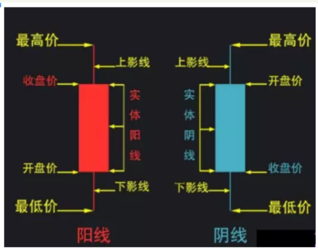 K线有4个价位组成:开盘价、收盘价、最高价、最低价。中间的矩形为实体,实体以上的细线为上影线,实体以下的细线叫做下影线。