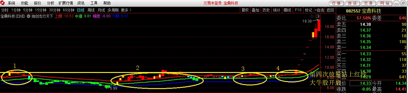 5.宝鼎科技主力同样是经过三次上碰红线,回落洗盘。在第三次之后主力来了个严重缩量,阴柔至极,接连十字星。第四次站上,是用了放量不回头了,一去不复返了。