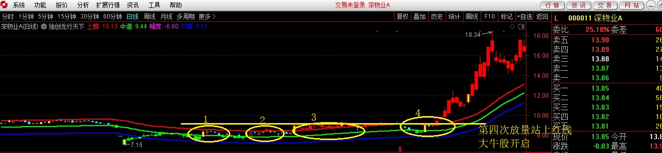 2.深物业A主力同样是经过三次上碰红线,回落洗盘,在第三次主力还挖了个坑,神奇之处洗到绿线嘎然而止,然后放量站上红线,即第四次站上之后,一去不复返了。