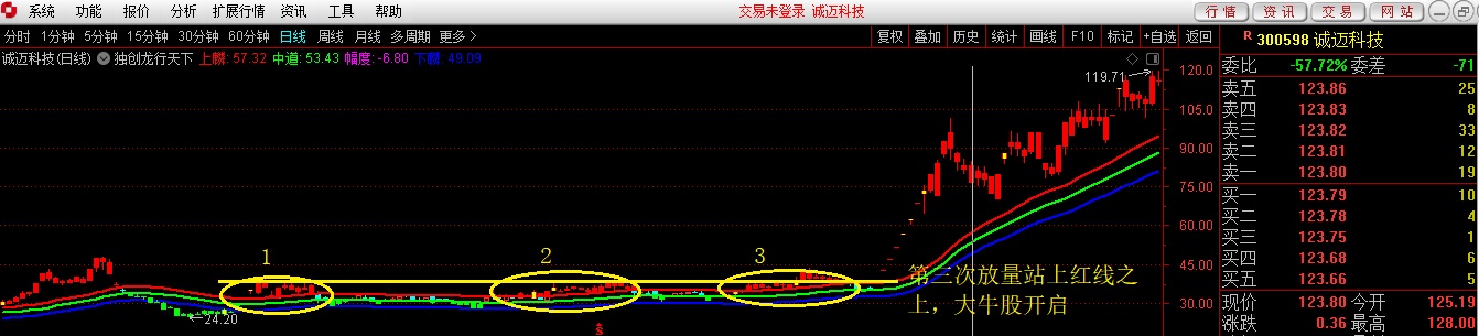 4.诚迈科技主力可以看出主力作风凌厉,前三次站上红线实力很强,然后又是大力洗盘打压,但是洗盘位置不敢破绿线,偶尔破下绿线也很快拉回,这就是主力强力运作之处。第四次站上红线是用一字板,不给散户机会了,之后,一去不复返了。