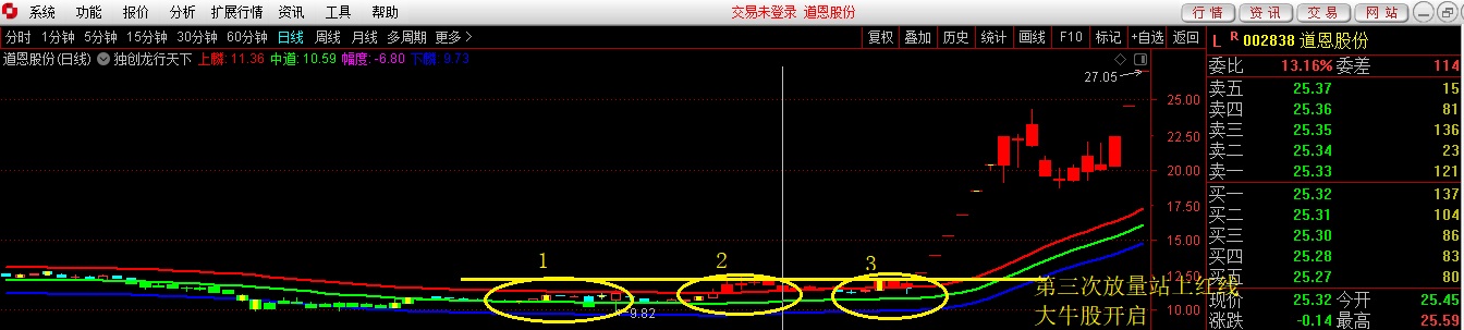 3.道恩股份主力是经过两次上碰红线,回落洗盘,在第三次主力即放量站上红线,主力实力强劲,一去不复返了。