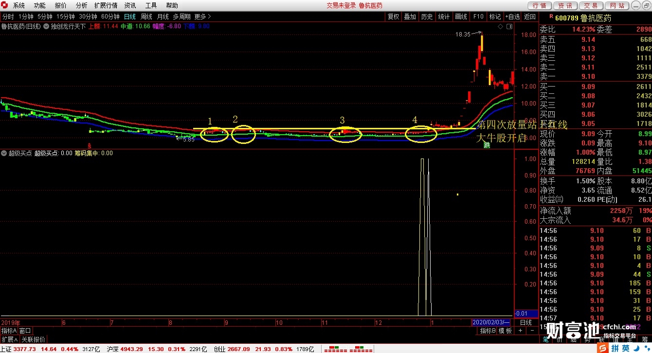 6.鲁抗医药主力同样是经过三次上碰红线,回落洗盘,在第四次主力站上红线之后,还在洗下,这个主力露出的马脚太明显了,也许是主力实力不够,明显是告诉市场,我资金不太够,大家来帮忙,主力心有余而力不足,但是呢,因为是题材的刺激,主力又想好好的拉是上去,造成量能急剧的放大,不管怎样,第四次放量站上红线之后,也是走成了大牛。