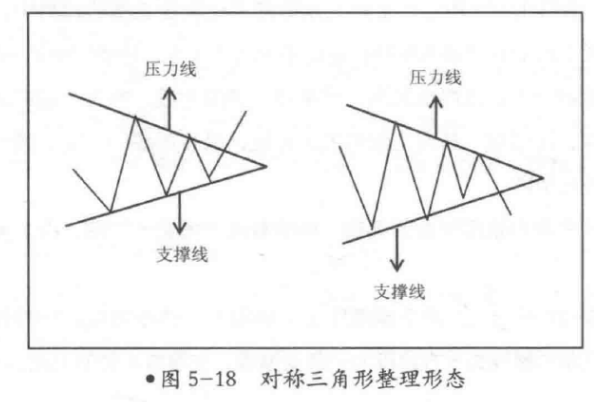 解析:如图5-18所示,对称三角形走势变动幅度逐渐缩小,即每次变动的最高价低于前一次,走势可能向上,也可能向下,在形态上呈压缩状图形。