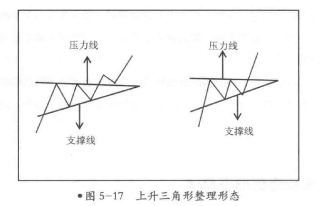如图5-17所示,三角形整理的上方线段为一条压力线,压制着走势的上涨。而三角形整理的下方线段为一条支撑线,支撑着走势的上涨。