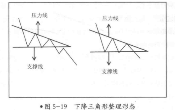 如图5-19所示,三角形整理的上方线段为一条压力线,压制着走势的上涨。而三角形整理的下方线段为一条支撑线,支撑着走势的上涨。