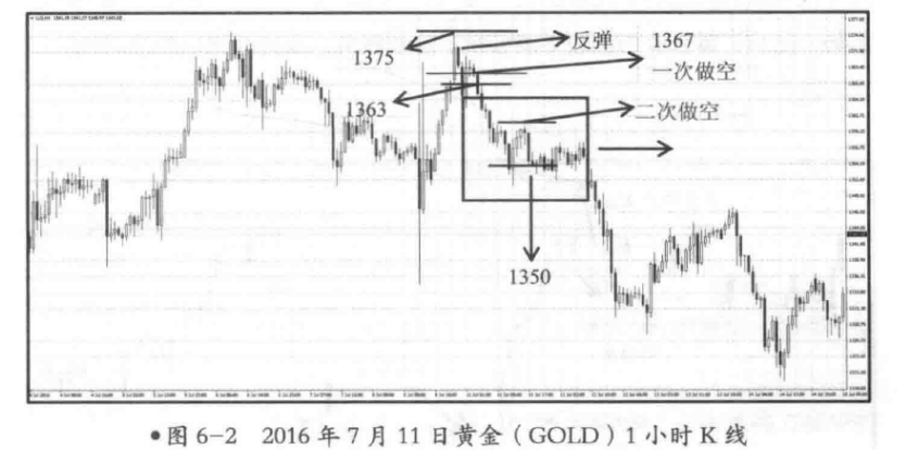 如图6-2所示,走势在跌破起涨点1367美元/盎司之后,将有一次做空的机会,欧盘若持续阴跌向下,美盘前的反弹可以二次建仓空单,也就是走势下跌的二次反弹的高点是一个二次建仓做空的机会。