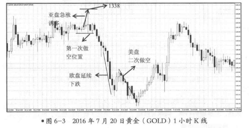 如图6-3所示,2016年7月20日,黄金价格走势早间开盘之后快速拉升至1338美元/盎司的高点位置,之后走势并没有延续上升,而是快速地回撤至起涨点1332美元/盎司的位置,即使回撤途中出现了小幅度的二次反弹,也没有再创新高,而是整理之后继续向下慢跌。