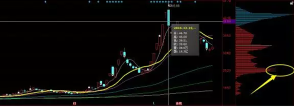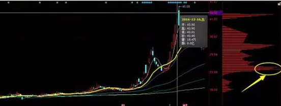 上面两张图之前的一只国资改概念的妖股于2016年12月16日和12月19日两个连续交易日的K线图以及主力筹码分布图。