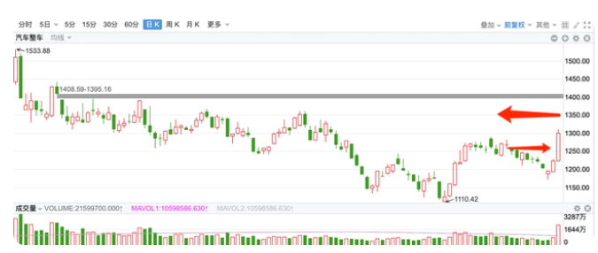 板块方面,今天房地产行业算是进入了回调行情,如果房地产板块放量调整的话,就要先采取落袋为安的策略了,既然是走出了预期行情,那就要采取相应的策略了。不过,市场最近偏好于涨大件,房地产行业进入调整行情,接着汽车行业就迎来了大涨,那么,汽车整车、燃气、汽车零部件的运行区间在哪里,策略是什么呢?