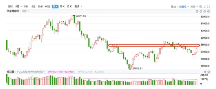 汽车零部件板块,作为汽车政策的下游,汽车整车行业上涨,自然也会带动整个产业链上涨的。相比汽车整车,汽车零部件板块的整体涨幅不大,如若反弹,后期获益会比汽车政策客观,既然今天该板块放量涨上了压力位,那短期第一目标位可以看到28300点附近,看到此处时能否有量能的配合,如若有量能配合,还可继续持仓。