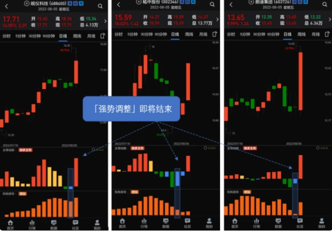第一,这三个个股都属于「强势阶段」,也就是大资金在积极参与交易,这样的个股更有机会。