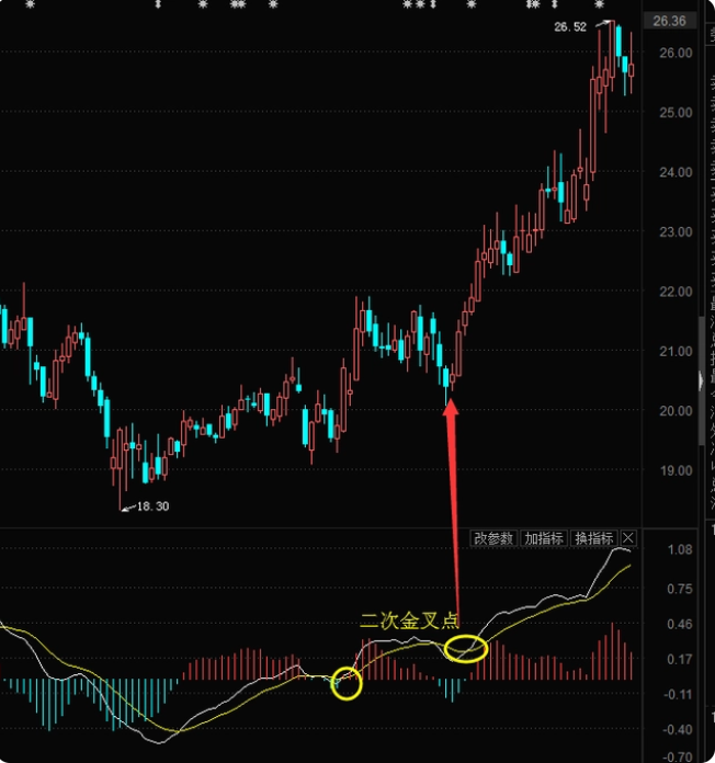 在短线技巧中,MACD的二次金叉意味着短线的进场。MACD的二次金叉说明股价二次探底成功,股价反转向上的可能性极大,短线投资可积极介入。