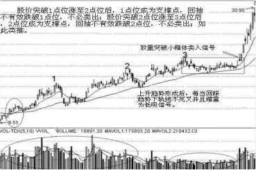 但是在真正买入时机的最终把握上,几乎所有的论述都是语焉不详,只是画出一个抽象的股价运行图来标出这几个买点。然而,由于个股形态构筑上的差别,股价向上突破、回抽的时候所表现出来的状态也是不同的,尤其是回抽的形态,很多人都看不懂,最终错失了黄金的买入时机。那么怎么样才能尽量的缩短自己买入时点和股价起涨时点的时间差呢?有句行话叫“量在价先”,就是说当股价出现变动的时候,首先必然是成交量发生变化,然后才引致股价发生变化。这是一个很精辟的描述,所以在捕捉这些黄金买点的时候,一定要注意一个前提,就是你已经对底部、黄金买点形成做出了准确的判断。如下图: