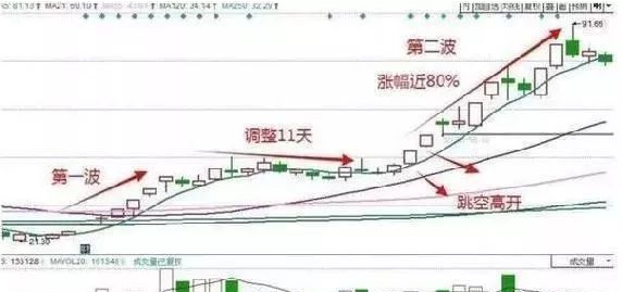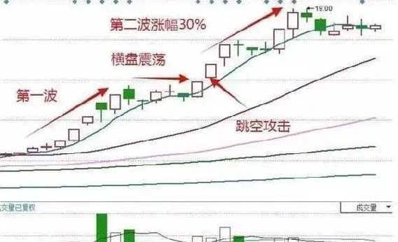 股价在底部拉升后,出现震荡整理,然后某一天出现跳空的高开,伴有成交量的放大,我们就要认真观察,满足以上几个条件的时候,随时准备介入。