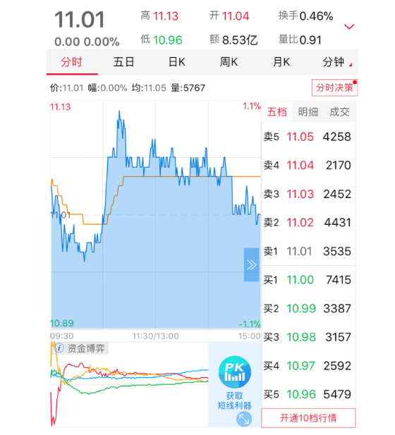 ①11.01为该时段该股票每股的市场价格,每支股票一次至少交易100股=1手。11.01为市场价格而不是账面价值,市场价格可能高于账面价值也可能低于账面价值。0.00为现在的价格减去平盘价(也就是昨收盘)的价格,这只股票昨日收盘价也是11.01,故11.01-11.01=0.00,0.00%为涨跌百分比,等于实际涨跌额除以平盘价。(11.01-11.01)/11.01=0.00%。