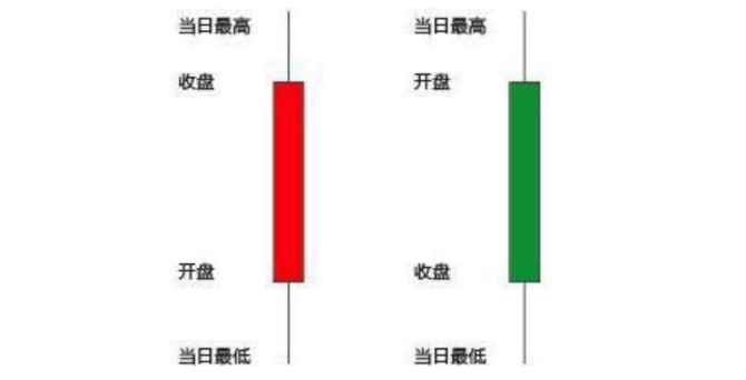 上影线顶端代表当日最高价格,下影线底端代表当日最低价格。绿色实体上边界表示开盘价格,下边界表示收盘价格,收盘价格低于开盘价格为下跌。