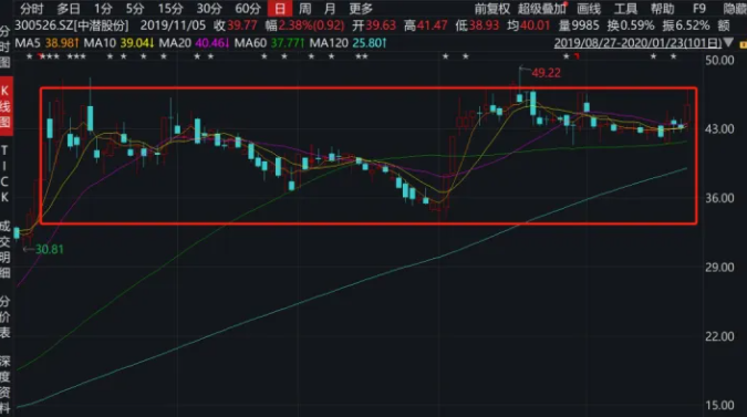 比如中潜股份,2019年底到2020年初的K线里,有非常多的上下影线,同时不论大盘涨跌,中潜股份的股价不是大涨,就是调整。